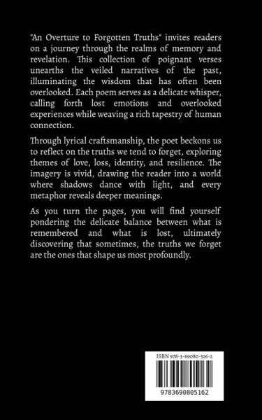 "An Overture to Forgotten Truths" invites readers on a journey through the realms of memory and revelation. This collection of poignant verses unearths the veiled narratives of the past, illuminating the wisdom that has often been overlooked. Each poem serves as a delicate whisper, calling forth lost emotions and overlooked experiences while weaving a rich tapestry of human connection. Through lyrical craftsmanship, the poet beckons us to reflect on the truths we tend to forget, exploring themes of love, loss, identity, and resilience. The imagery is vivid, drawing the reader into a world where shadows dance with light, and every metaphor reveals deeper meanings. As you turn the pages, you will find yourself pondering the delicate balance between what is remembered and what is lost, ultimately discovering that sometimes, the truths we forget are the ones that shape us most profoundly.