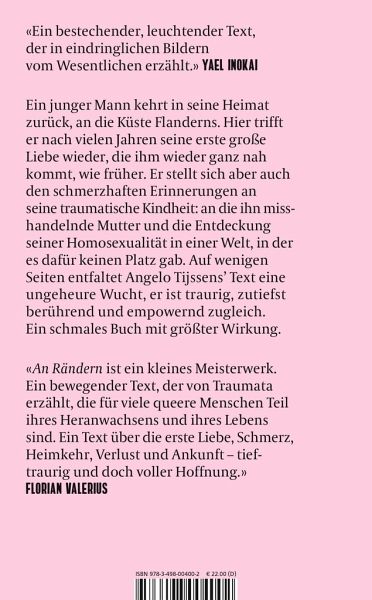 «An Rändern ist ein kleines Meisterwerk. Ein bewegender Text, der von Traumata erzählt, die für viele queere Menschen Teil ihres Heranwachsens und ihres Lebens sind. Ein Text über die erste Liebe, Schmerz, Heimkehr, Verlust und Ankunft - tieftraurig und doch voller Hoffnung.» Florian Valerius