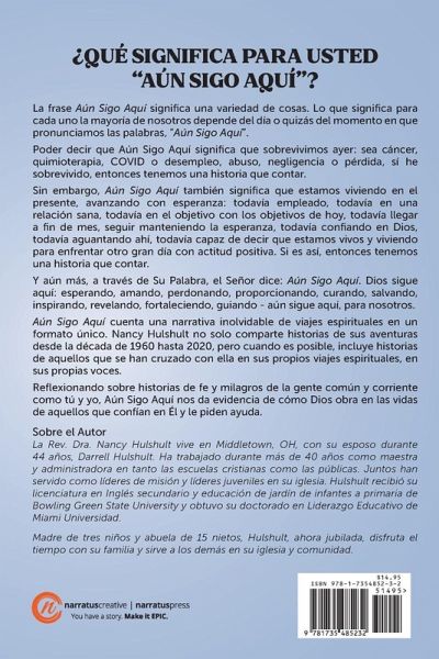 La frase Aún Sigo Aquí significa una variedad de cosas. Lo que significa para cada uno la mayoría de nosotros depende del día o quizás del momento en que pronunciamos las palabras, "Aún Sigo Aquí". Poder decir que Aún Sigo Aquí significa que sobrevivimos ayer: sea cáncer, quimioterapia, COVID o desempleo, abuso, negligencia o pérdida, sí he sobrevivido, entonces tenemos una historia que contar. Sin embargo, Aún Sigo Aquí también significa que estamos viviendo en el presente, avanzando con esperanza: todavía empleado, todavía en una relación sana, todavía en el objetivo con los objetivos de hoy, todavía llegar a fin de mes, seguir manteniendo la esperanza, todavía confiando en Dios, todavía aguantando ahí, todavía capaz de decir que estamos vivos y viviendo para enfrentar otro gran día con actitud positiva. Si es así, entonces tenemos una historia que contar. Y aún más, a través de Su Palabra, el Señor dice: Aún Sigo Aquí. Dios sigue aquí: esperando, amando, perdonando, proporcionando, curando, salvando, inspirando, revelando, fortaleciendo, guiando - aún sigue aquí, para nosotros. Aún Sigo Aquí cuenta una narrativa inolvidable de viajes espirituales en un formato único. Nancy Hulshult no solo comparte historias de sus aventuras desde la década de 1960 hasta 2020, pero cuando es posible, incluye historias de aquellos que se han cruzado con ella en sus propios viajes espirituales, en sus propias voces. Reflexionando sobre historias de fe y milagros de la gente común y corriente como tú y yo, Aún Sigo Aquí nos da evidencia de cómo Dios obra en las vidas de aquellos que confían en Él y le piden ayuda.