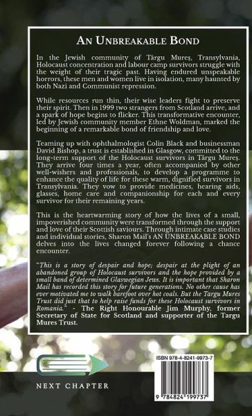 In the Jewish community of Târgu Mureș, Transylvania, Holocaust concentration and labour camp survivors struggle with the weight of their tragic past. Having endured unspeakable horrors, these men and women live in isolation, many haunted by both Nazi and Communist repression. While resources run thin, their wise leaders fight to preserve their spirit. Then in 1999 two strangers from Scotland arrive, and a spark of hope begins to flicker. This transformative encounter, led by Jewish community member Ethne Woldman, marked the beginning of a remarkable bond of friendship and love. Teaming up with ophthalmologist Colin Black and businessman David Bishop, a trust is established in Glasgow, committed to the long-term support of the Holocaust survivors in Târgu Mureș. They arrive four times a year, often accompanied by other well-wishers and professionals, to develop a programme to enhance the quality of life for these warm, dignified survivors in Transylvania. They vow to provide medicines, hearing aids, glasses, home care and companionship for each and every survivor for their remaining years. This is the heartwarming story of how the lives of a small, impoverished community were transformed through the support and love of their Scottish saviours. Through intimate case studies and individual stories, Sharon Mail's AN UNBREAKABLE BOND delves into the lives changed forever following a chance encounter. "This is a story of despair and hope; despair at the plight of an abandoned group of Holocaust survivors and the hope provided by a small band of determined Glaswegian Jews. It is important that Sharon Mail has recorded this story for future generations. No other cause has ever motivated me to walk barefoot over hot coals. But the Targu Mures Trust did just that to help raise funds for these Holocaust survivors in Romania." - The Right Honourable Jim Murphy, former Secretary of State for Scotland and supporter of the Targu Mures Trust