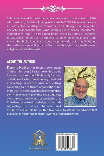 This fictional work is based partly on actual events that occurred in 1996, with the timing of this book being set in the fall of 2001. It is a presentation of an unexpected friendship that forms when a middle-aged man encounters one of his high school teachers who is intrigued by the book that a former student is writing. The two men begin a weekly series of breakfast discussions on topics such as predestination, original sin, abortion, and many other biblical and social issues. hopefully, the points made during these discussions Will provide "food for thought," or possibly even Enlightenment, to the reader.