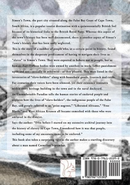 Simon's Town, the port city situated along the False Bay Coast of Cape Town, South Africa, is a popular tourist destination with a quintessentially British feel because of its historical links to the British Royal Navy. Whereas this aspect of the town's history has been well-documented, there is another aspect of Simon's Town's history that has been sadly neglected. This is the story of a number of people who, at a certain point in history, found themselves in the desperate predicament of having to navigate their lives as "slaves" in Simon's Town. They were expected to behave not as people, but as human chattel whose bodies were owned by another: to work, inflict punishment upon and use-sexually or otherwise-as they pleased. They were listed in the inventories of "slave-holders" along with household goods, livestock and cattle. For centuries their voices have been silenced, yet their existence resonates within every heritage building in the town and in the naval dockyard. An Uncomfortable Paradise tells the human stories of enslaved people and explores how the lives of "slave-holders", the indigenous people of the False Bay, and people referred to as "prize negroes," "Liberated Africans," "Free Blacks" and West African Krumen all became enmeshed with those who were enslaved in the district. Says the author: "Even before I started on my extensive archival journey into the history of slavery in Cape Town, I wondered how it was that people, including some of my ancestors, came to be enslaved." This book also takes a surprising turn as the author makes a startling discovery about a man named Cornelius September.
