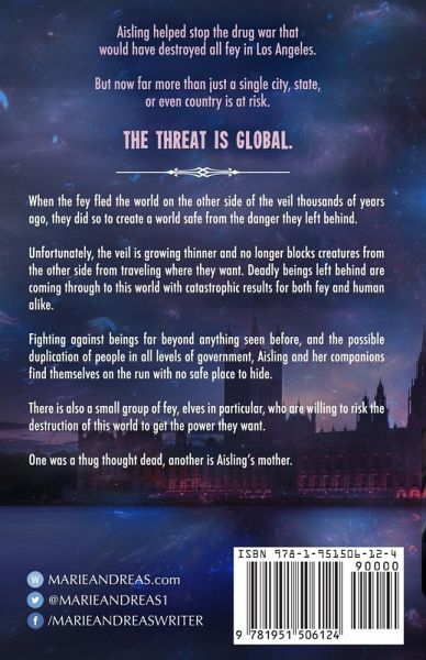 Aisling helped stop the drug war that would have destroyed all fey in Los Angeles. But now far more than just a single city, state, or even country is at risk. The threat is global. When the fey fled the world on the other side of the veil thousands of years ago, they did so to create a world safe from the danger they left behind. Unfortunately, the veil is growing thinner and no longer blocks creatures from the other side from traveling where they want. Deadly beings left behind are coming through to this world with catastrophic results for both fey and human alike. Fighting against beings far beyond anything seen before, and the possible duplication of people in all levels of government, Aisling and her companions find themselves on the run with no safe place to hide. There is also a small group of fey, elves in particular, who are willing to risk the destruction of this world to get the power they want. One was a thug thought dead, another is Aisling's mother.