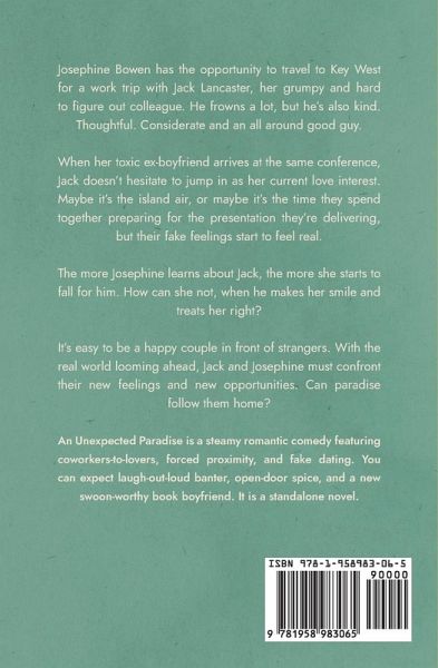 Josephine Bowen has the opportunity to travel to Key West for a work trip with Jack Lancaster, her grumpy and hard to figure out colleague. He frowns a lot, but he's also kind. Thoughtful. Considerate and an all around good guy. When her toxic ex-boyfriend arrives at the same conference, Jack doesn't hesitate to jump in as her current love interest. Maybe it's the island air, or maybe it's the time they spend together preparing for the presentation they're delivering, but their fake feelings start to feel real. The more Josephine learns about Jack, the more she starts to fall for him. How can she not, when he makes her smile and treats her right? It's easy to be a happy couple in front of strangers. With the real world looming ahead, Jack and Josephine must confront their new feelings and new opportunities. Can paradise follow them home? An Unexpected Paradise is a steamy romantic comedy featuring coworkers-to-lovers, forced proximity, and fake dating. You can expect laugh-out-loud banter, open-door spice, and a new swoon-worthy book boyfriend. It is a standalone novel.