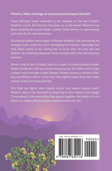 What's a little marriage of convenience between friends? Claire Winesett never expected to be sleeping on her best friend's brother's couch. But the last nine years as a solo-travel influencer has been anything but predictable. Luckily, Claire thrives on spontaneity, and after all, it's only temporary. Boundaries define every aspect of Rowan Bellamy's life, and having his teenage crush under his roof is disrupting his routines. Especially now that Claire seems to be seeing him as more than the boy she left behind-the chemistry between them sizzling hotter than the Arizonan summer. When a trip to the ER leads Claire on a path to crushing medical debt, Rowan shocks her with an unexpected proposal. But Claire can't accept a paper-only marriage to gain Rowan's health insurance without offering something in return-a Fun Pact. Two nights a week, they add a little variety to Rowan's measured life. Old West bar fights, silent desert discos, and improv lessons aren't Rowan's idea of fun, but he'll do anything to hear Claire's snort laugh. The problem is the more time they spend together, the harder it is for Rowan to subdue the possessive impulse to kiss his wife. Enjoy all the forced proximity tension and sizzling kisses of this best friend's brother, marriage of convenience, opposites attract closed-door/fade-to-black romance by grabbing your copy TODAY!