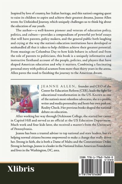 Inspired by love of country, her Italian heritage, and this nation's ongoing quest to raise its children to aspire and achieve their greatest dreams, Jeanne Allen wrote An Unfinished Journey, which uniquely challenges us to think big about the education of our youth. The author-a well-known pioneer and veteran of education policy, politics, and culture-provides a compendium of powerful yet brief essays that will have parents, policy makers, and the general public both laughing and crying at the way the nation's education institutions have developed or mishandled all that it takes to help children achieve their greatest potential. From musings on Columbus Day to how kids behave in school and from the role of parents to politicians, this book is a uniquely informative and instructive firsthand account of the people, policies, and players that have shaped American education and why it matters. Combining a fascinating personal story with political acumen from more than thirty years in the arena, Allen paves the road to finishing the journey to the American dream.