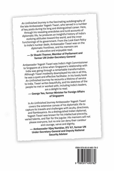 An Unfinished Journey is the fascinating autobiography of the late Ambassador Yogesh Tiwari, who served in a number of key posts during his long and distinguished career. Here, through his revealing anecdotes and lucid accounts of diplomatic life, he produces an insightful history of India's revolving attitudes toward the world, and the inner functionings of its government. From the Look East Policy to India's nuclear deals, Ambassador Tiwari was on the diplomatic frontlines, and his memoirs are an educative and enjoyable read.- Dr Shashi Tharoor, Mamber of Parliament and former UN Under-Secretary-General Ambassador Yogesh Tiwari was India's High Commissioner to Singapore at a time when Singapore's relationship with India was going through a remarkable transformation. Although Tiwari modestly downplayed his own role in all this, he was a quiet and effective facilitator. In his lovely book An Unfinished Journey, he recounted a lifetime of service to India. Tiwari writes beautifully,andhis sketches of the people he met or worked with, including India's leaders, are a delight to read.- George Yeo, former Minister for Foreign Affairs of Singapore In An Unfinished Journey Ambassador Yogesh Tiwari covers the extensive canvas of his diplomatic life to capture its travails and challenges with acuity, directness and flamboyance. As a distinguished Indian diplomat, Yogesh Tiwari was known for his intellectual precocity, varied talents and flair for the jugular. His memoirs will not please everyone, but no one can deny their candour and courage, verve and dignity.- Ambassador Vijay Nambiar, IFS '67, former UN Under-Secretary-General and Deputy National Security Advisor