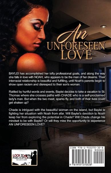 BAYLEI has accomplished her lofty professional goals, and along the way she falls in love with NOAH, who appears to be the man of her dreams. Their interracial relationship is beautiful and fulfilling, until Noah's parents begin to show open racism and disrespect to their son's woman. Rattled by hurtful words and events, Baylei decides to take a vacation to St. Thomas where she crosses paths with CHADE who is a self-proclaimed lady's man. But when the two meet, sparks fly, and both of their lives could get shaken up? Chade is intrigued with the beautiful woman on the island, but Baylei is fighting her situation with Noah from afar. Will Baylei's devotion to Noah keep her from exploring the potential in Chade? Will Chade change his mindset to be with Baylei? Or will they miss the opportunity to experience AN UNFORESEEN LOVE?