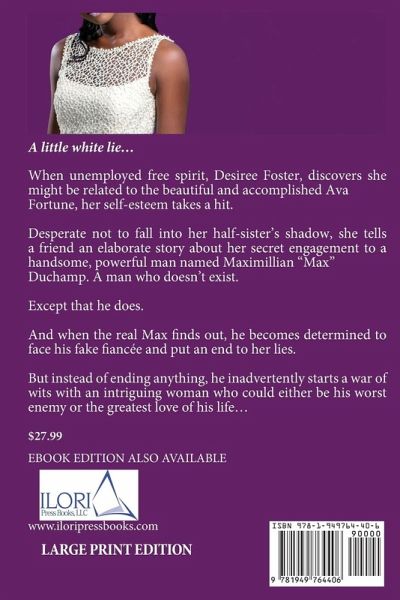 Large Print Edition A little white lie… When unemployed free spirit, Desiree Foster, discovers she might be related to the beautiful and accomplished Ava Fortune, her self-esteem takes a hit. Desperate not to fall into her half-sister’s shadow, she tells a friend an elaborate story about her secret engagement to a handsome, powerful man named Maximillian "Max" Duchamp. A man who doesn’t exist. Except that he does. And when the real Max finds out, he becomes determined to face his fake fiancée and put an end to her lies. But instead of ending anything, he inadvertently starts a war of wits with an intriguing woman who could either be his worst enemy or the greatest love of his life…