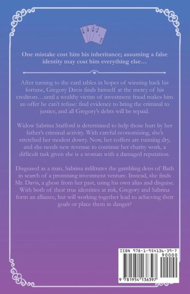 One mistake cost him his inheritance; assuming a false identity may cost him everything else... After turning to the card tables in hopes of winning back his fortune, Gregory Davis finds himself at the mercy of his creditors...until a wealthy victim of investment fraud makes him an offer he can't refuse: find evidence to bring the criminal to justice, and all Gregory's debts will be repaid. Widow Sabrina Stafford is determined to help those hurt by her father's criminal activity. With careful economizing, she's stretched her modest dowry. Now, her coffers are running dry, and she needs new revenue to continue her charity work, a difficult task given she is a woman with a damaged reputation. Disguised as a man, Sabrina infiltrates the gambling dens of Bath in search of a promising investment venture. Instead, she finds Mr. Davis, a ghost from her past, using his own alias and disguise. With both of their true identities at risk, Gregory and Sabrina form an alliance, but will working together lead to achieving their goals or place them in danger?