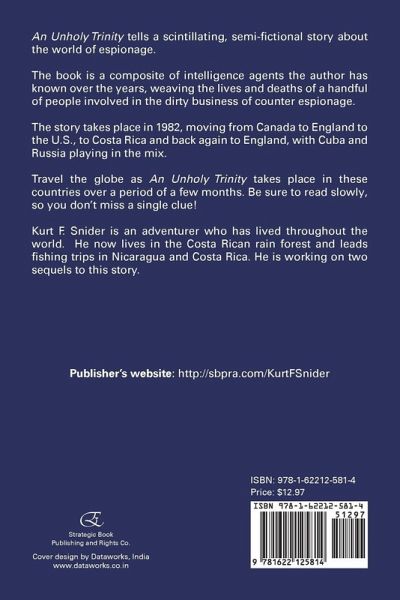 An Unholy Trinity tells a scintillating, semi-fictional story about the world of espionage. The book is a composite of intelligence agents the author has known over the years, weaving the lives and deaths of a handful of people involved in the dirty business of counter espionage. The story takes place in 1982, moving from Canada to England to the U.S., to Costa Rica and back again to England, with Cuba and Russia playing in the mix. Travel the globe as An Unholy Trinity takes place in these countries over a period of a few months. Be sure to read slowly, so you don't miss a single clue! Kurt F. Snider is an adventurer who has lived throughout the world. He now lives in the Costa Rican rain forest and leads fishing trips in Nicaragua and Costa Rica. He is working on two sequels to this story. Publisher's website: http://sbpra.com/KurtFSnider