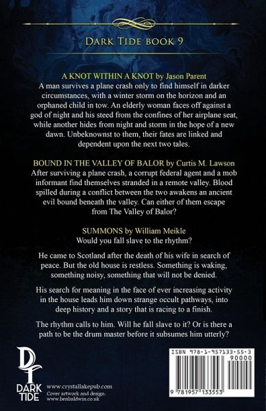 Three unique voices in today's horror bring you new takes on an old power that threatens to reshape our world. Celtic legends are reborn within these pages, with fresh stories guaranteed to spark nightmares in the vein of Grimm's pre-Disneyfied fairy tales. A Knot Within A Knot by Jason Parent: A man survives a plane crash only to find himself in darker circumstances, with a winter storm on the horizon and an orphaned child in tow. An elderly woman faces off against a god of night and his steed from the confines of her airplane seat, while another hides from night and storm in the hope of a new dawn. Unbeknownst to them, their fates are linked and dependent upon the next two tales. Bound in the Valley of Balor by Curtis M. Lawson: After surviving a plane crash, a corrupt federal agent and a mob informant find themselves stranded in a remote valley. Blood spilled during a conflict between the two awakens an ancient evil bound beneath the valley. Can either of them escape from The Valley of Balor? Summons by William Meikle (part of hisMythos of Sigils & Totems): Would you fall slave to the rhythm? He came to Scotland after the death of his wife in search of peace. But the old house is restless. Something is waking, something noisy, something that will not be denied. His search for meaning in the face of ever increasing activity in the house leads him down strange occult pathways, into deep history and a story that is racing to a finish. The rhythm calls to him. Will he fall slave to it? Or is there a path to be the drum master before it subsumes him utterly? This Celtic horror anthology is perfect for fans of folk horror, myths and legends, supernatural horror fiction, Grimm fairy tales, and Scottish survival horror, or fans of Ritual by Adam Nevill, Bag of Bones by Stephen King, or the legendary Ramsey Cambell. Crystal Lake's Dark Tide series will continue soon with more tales of Mystery Thrillers and Horror Books, including themes of Weird Western, Sherlock Holmes, Grief Horror, Body Horror, Mystery fiction, Travel Horror, Deadly Duos, and Psychological Thriller books. Proudly represented by Crystal Lake Publishing-Tales from the Darkest Depths.