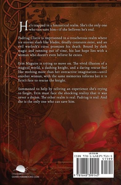 He's trapped in a fantastical realm. She's the only one who can save him-if she believes he's real. Padriag Clarre is imprisoned in a treacherous realm where ice storms slash like blades, deadly creatures exist, and an evil warlock's curse promises his death. Bound by dark magic and running out of time, his last hope lies with a woman who doesn't even believe he exists. Erin Maguire is trying to move on. The vivid illusion of a magical world, a dashing knight, and a daring rescue feel like nothing more than her overactive imagination-until another woman, with the same memories informs her it is Erin's fate to rescue the knight. Summoned to help by reliving an experience she's trying to forget, Erin must face the shocking reality that it was never a dream. The other realm is real. Padriag is real. And she is the only one who can save him.