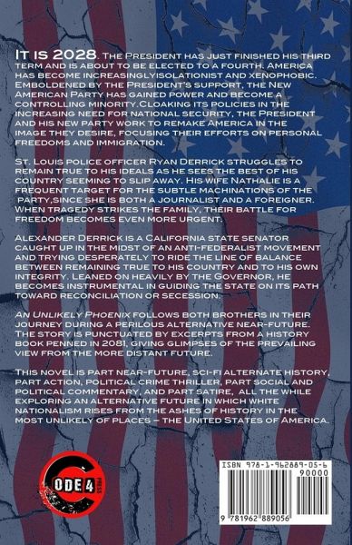 It is 2028. President Trump has just finished his third term and is about to be elected to a fourth. America has become increasingly isolationist and xenophobic. Emboldened by the President's support, the New American Party has gained power and become a controlling minority. Cloaking its policies in the increasing need for national security, the President and his new party work to remake America in the image they desire, focusing their efforts on personal freedoms and immigration. St. Louis police officer Ryan Derrick struggles to remain true to his ideals as he sees the best of his country seeming to slip away. His wife Nathalie is a frequent target for the subtle machinations of the party, since she is both a journalist and a foreigner. When tragedy strikes the family, their battle for freedom becomes even more urgent. Alexander Derrick is a California state senator caught up in the midst of an anti-federalist movement and trying desperately to ride the line of balance between remaining true to his country and to his own integrity. Leaned on heavily by the Governor, he becomes instrumental in guiding the state on its path toward reconciliation or secession. An Unlikely Phoenix follows both brothers in their journey during a perilous alternative near-future. The story is punctuated by excerpts from a history book penned in 2081, giving glimpses of the prevailing view from the more distant future. This novel is part near-future, sci-fi alternate history, part action, political crime thriller, part social and political commentary, and part satire, all the while exploring an alternative future in which white nationalism has risen from the ashes of history in the most unlikely of places - the United States of America.