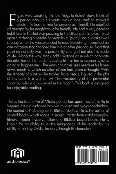Figuratively speaking this is a "rags to riches" story. It tells of a person who, in his youth, was a loner and an avowed atheist. He had no time for anyone but himself. He rebuffed all attempts by his neighbors to be friendly. He had a very peculiar habit later in life that was puzzling to the citizens of his town. Thrust upon him during his declining years by a "pushy" social worker was a baby whom he was expected to rear. Something happened on one occasion that changed him into another personality. From that point on not only was his personality changed but also his mode of life. Along the way many odd situations arise which captivate the attention of the reader, causing him or her to wonder what is going to happen next. The main character sees needs in his home town, needs to which no other citizen had given a thought. With the tenacity of a pit bull he tackles those needs. Figured in the plot of this book is a woman with the vocabulary of the proverbial sailor but who is a "diamond in the rough". This book is designed for enjoyable reading.