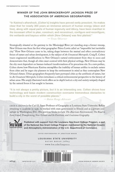 "An Unnatural Metropolis" offers an in-depth look at a city and society uniquely shaped by the natural forces it has sought to harness. Strategically situated at the gateway to the Mississippi River yet standing atop a former swamp, New Orleans was from the first what geographer Peirce Lewis called an "impossible but inevitable city." How New Orleans came to be, taking shape between the mutual and often contradictory forces of nature and urban development, is the subject of "An Unnatural Metropolis." Though all cities must contend with their physical settings, Craig E. Colten demonstrates that New Orleans may be the city most dependent on human-induced transformations of its precarious site. Colten traces engineered modifications to New Orleans's natural environment from 1800 to 2000. Before the city could swell in size and commercial importance as its nineteenth-century boosters envisioned, builders had to wrest it from its waterlogged site, protect it from floods, expel disease, and supply basic services using local resources. Colten shows how every manipulation of the environment made an impact on the city's social geography as well-often with unequal, adverse consequences for minorities-and how each still requires maintenance and improvement today. For example, while the massive levee system has controlled the unpredictable Mississippi, it also captures heavy downpours, creating a new set of internal flood problems. Recent federal regulations and environmental activism have converted the river from a sewage carrier to a protected water supply, reclassified garbage dumps as hazardous waste sites, and attempted to restore some of the city's swamps-but with difficult social and political adjustments.