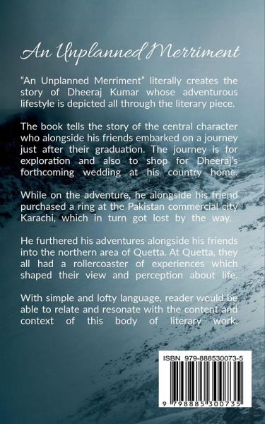 "An Unplanned Merriment" literally creates the story of Dheeraj Kumar whose adventurous lifestyle is depicted all through the literary piece. The book tells the story of the central character who along with his friends embarked on a journey just after their graduation. The journey is for exploration and also to shop for Dheeraj’s forthcoming wedding at his country home. While on the adventure Journey, he alongside his friend purchased a ring in the Pakistani commercial city Karachi, which in turn got lost on the way. His adventures (An Unplanned Merriment) continued with his friends in Quetta, a city in the North-west. At Quetta, they all had a rollercoaster of experiences that shaped their view and perception of life. With simple and lofty language, readers would be able to relate and resonate with the content and context of this body of literary work.