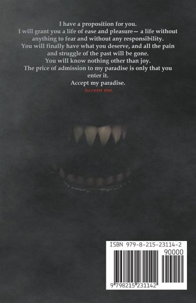 I have a proposition for you. I will grant you a life of ease and pleasure— a life without anything to fear and without any responsibility. You will finally have what you deserve, and all the pain and struggle of the past will be gone. You will know nothing other than joy. The price of admission to my paradise is only that you enter it. Accept my paradise. Accept me. Nota bene: this book's genre would best be described as erotic horror.