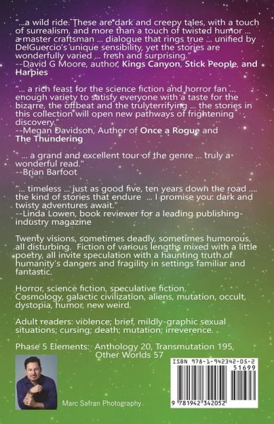 An Unsettled Score is a collection of short works by award-nominated author Christopher L. DelGuercio. This, his first collection, includes twenty twisted visions of speculative fiction spanning thrilling adventures on far flung, alien worlds and dystopian futurescapes, to mind-bending surrealities and nightmarish encounters with evil, to the bitingly satirical and overtly comical, these dark-hearted tales of monsters and mayhems are designed to entertain and delight, surprise and move. Ranging from poetic verse and flash fiction to novella-length narratives, in the rich tradition of such shining stars of the short form as Bradbury, Ellison, Gaiman, King, Martin, and Vonnegut, we can add an exciting new collection, An Unsettled Score. If you're in the mood for a hearty stew of stories to feed your cravings for the bizarre, the wondrous, and the macabre, take a stroll through the twisted visions of An Unsettled Score. Praise includes: "... a wild ride. These are dark and creepy tales, with a touch of surrealism, and more than a touch of twisted humor ... a master craftsman ... terse and distilled-not a word or sentence is wasted ... dialogue that rings true, regardless of character or setting ... fresh and surprising. What a rich and mysterious imagination this author has." --David G Moore, author, Kings Canyon, Stick People, and Harpies "... a rich feast for the science fiction and horror fan. His stories, poems and longer fiction offer enough variety to satisfy everyone with a taste for the bizarre, the offbeat and the truly terrifying ... very reminiscent of the works of the famed science fiction/horror writer Ray Bradbury (The Martian Chronicles) and display the same sense of carefully twisted reality that the master writer is known for ... an intricate journey into an incredible world to reveal what it means to be human, as well as inhuman ... an engrossing dynamic that combines slowly unraveling details with throat-gripping action ... makes DelGuercio's prose stand out from that of many other fantasy writers. For all those who favor horror and science fiction - and all areas in between or intermingled - the stories in this collection will open new pathways of frightening discovery. --Megan Davidson, Author of Once a Rogue and The Thundering "... a writer in the classical sense. His work is timeless. He doesn't rely on any flavor-of-the-month tropes or ripped-from-the-headlines topics. Nearly any Christopher DelGuercio story that you read today will age well and be just as good five, ten years down the road ... the kind of stories that endure." --Linda Lowen, book reviewer for a leading industry magazine Collection Includes: Original Sin Dark Men, Dark Machines A Time Bully's Report: August 13, 2046 Eden Succeeding, CNY Book-of-the-Year nominated novella Man Farm Shi'roc-Su Béba Daio's Inches The Starway Pass Marvels Of The Burger King Parking Lot The Book of Judy Every Good Stud Comes To His Senses Metal With Me The Arcadian Nights Of Rigel Kent Farewell Luther Two Cups Copycat Jack Unbreakable Yu A Portrait of The Artist As a Stung Man Heavy Is The Head Tempus Servivit Bonus: Intro by the author to each piece regarding seed conception, influences, and history. Phase 5 Elements: Anthology 20, Transmutation 195, Other Worlds 57 Horror, science fiction, speculative fiction. Cosmology, galactic civilization, aliens, mutation, occult, reality manipulation, colonization, dystopia, humor, new weird. Adult readers: violence; brief, mildly-graphic sexual situations; cursing; death; mutation; irreverence.