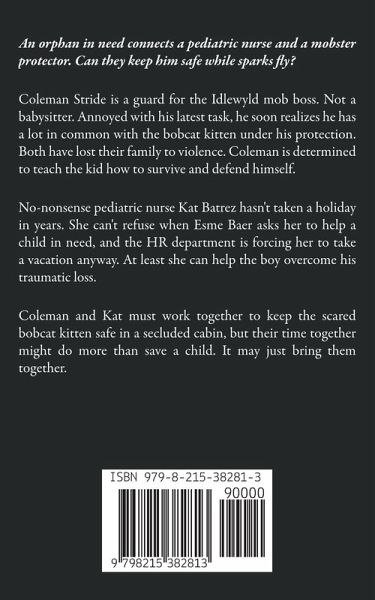 An orphan in need connects a pediatric nurse and a mobster protector. Can they keep him safe while sparks fly? Coleman Stride is a guard for the Idlewyld mob boss. Not a babysitter. Annoyed with his latest task, he soon realizes he has a lot in common with the bobcat kitten under his protection. Both have lost their family to violence. Coleman is determined to teach the kid how to survive and defend himself. No-nonsense pediatric nurse Kat Batrez hasn't taken a holiday in years. She can't refuse when Esme Baer asks her to help a child in need, and the HR department is forcing her to take a vacation anyway. At least she can help the boy overcome his traumatic loss. Coleman and Kat must work together to keep the scared bobcat kitten safe in a secluded cabin, but their time together might do more than save a child. It may just bring them together.