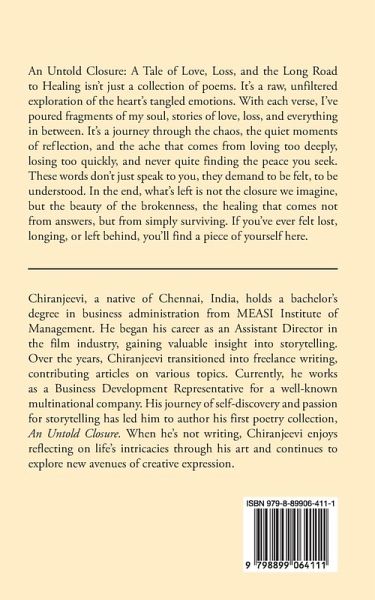 An Untold Closure: A Tale of Love, Loss, and the Long Road to Healing isn't just a collection of poems. It's a raw, unfiltered exploration of the heart's tangled emotions. With each verse, I've poured fragments of my soul, stories of love, loss, and everything in between. It's a journey through the chaos, the quiet moments of reflection, and the ache that comes from loving too deeply, losing too quickly, and never quite finding the peace you seek. These words don't just speak to you, they demand to be felt, to be understood. In the end, what's left is not the closure we imagine, but the beauty of the brokenness, the healing that comes not from answers, but from simply surviving. If you've ever felt lost, longing, or left behind, you'll find a piece of yourself here.