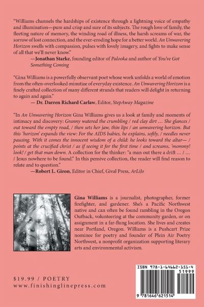 An Unwavering Horizon is a finely crafted collection that explores perspectives and understandings often missed in the hustle and crush of everyday life. The beautiful things. The ugly things. The poetry of things. Gina Williams takes an honest, questioning look at the hard realities of the human condition, from family crisis to war to our precarious place in the natural world, while also seeking answers and offering hope for the future. Jonathan Starke, editor of Palooka and author of You've Got Something Coming writes, "Williams channels the hardships of existence through a lightning voice of empathy and illumination-pure and crisp and sure of its subjects. The rough love of family, the fleeting nature of memory, the winding road of illness, the harsh screams of war, the sorrow of lost connection, and the ever-eroding hope for a better world." The highly visual imagery and lyrical, yet grounded poetry of An Unwavering Horizon takes the reader on a satisfying and thought-provoking journey through the natural and human elements of Earth/Truth; Spirit/Power; Air/Love; and Water/Wisdom.