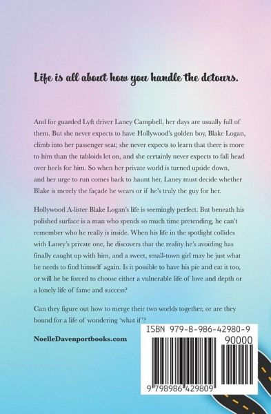 Life is all about how you handle the detours. And for guarded Lyft driver Laney Campbell, her days are usually full of them. But she never expects to have Hollywood's golden boy, Blake Logan, climb into her passenger seat; she never expects to learn that there is more to him than the tabloids let on, and she certainly never expects to fall head over heels for him. So when her private world is turned upside down, and her urge to run comes back to haunt her, Laney must decide whether Blake is merely the façade he wears or if he's truly the guy for her. Hollywood A-lister Blake Logan's life is seemingly perfect. But beneath his polished surface is a man who spends so much time pretending, he can't remember who he really is inside. When his life in the spotlight collides with Laney's private one, he discovers that the reality he's avoiding has finally caught up with him, and a sweet, small-town girl may be just what he needs to find himself again. Is it possible to have his pie and eat it too, or will he be forced to choose either a vulnerable life of love and depth or a lonely life of fame and success? Can they figure out how to merge their two worlds together, or are they bound for a life of wondering 'what if'?