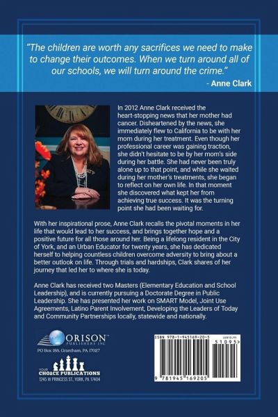 In 2012 Anne Clark received the heart-stopping news that her mother had cancer. Disheartened by the news, she immediately flew to California to be with her mom during her treatment. Even though her professional career was gaining traction, she didnt hesitate to be by her moms side during her battle. She had never been truly alone up to that point, and while she waited during her mothers treatments, she began to reflect on her own life. In that moment she discovered what kept her from achieving true success. It was the turning point she had been waiting for. With her inspirational prose, Anne Clark recalls the pivotal moments in her life that would lead to her success, and brings together hope and a positive future for all those around her. Being a lifelong resident in the City of York, and an Urban Educator for twenty years, she has dedicated herself to helping countless children overcome advertsity to bring about a better outlook on life. Through trials and hardships, Clark shares of her ourney that led her to where she is today. Anne Clark has received two Masters and is currently pursuing a Doctorate Degree in Public Leadership. She has presented her work on SMART model, Joint Use Agreements, Latino Parent Involvement, Developing the Leaders of Today and Community Partnerships locally, statewide and nationally.