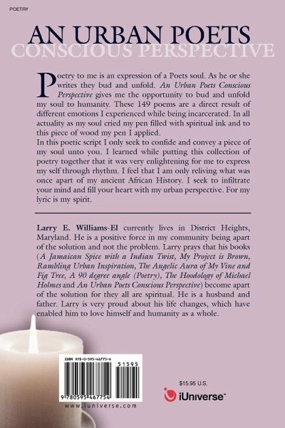 Poetry to me is an expression of a Poets soul. As he or she writes they bud and unfold. An Urban Poets Conscious Perspective gives me the opportunity to bud and unfold my soul to humanity. These 149 poems are a direct result of different emotions I experienced while being incarcerated. In all actuality as my soul cried my pen filled with spiritual ink and to this piece of wood my pen I applied. In this poetic script I only seek to confide and convey a piece of my soul unto you. I learned while putting this collection of poetry together that it was very enlightening for me to express my self through rhythm. I feel that I am only reliving what was once apart of my ancient African History. I seek to infiltrate your mind and fill your heart with my urban perspective. For my lyric is my spirit.
