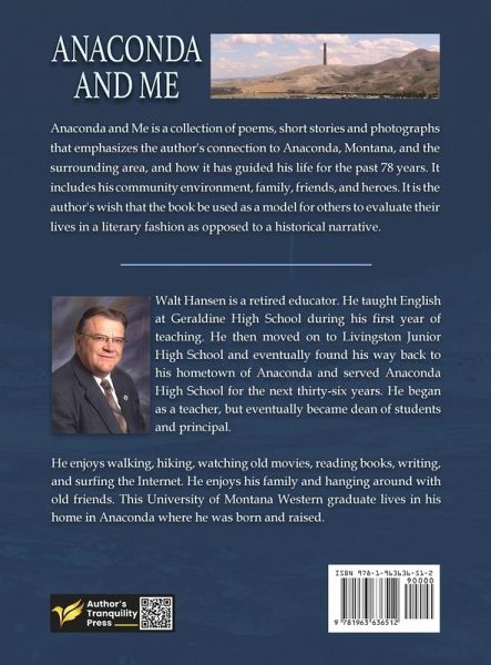 Anaconda and Me is a collection of poems, short stories and photographs that emphasizes the author's connection to Anaconda, Montana, and the surrounding area, and how it has guided his life for the past 78 years. It includes his community environment, family, friends, and heroes. It is the author's wish that the book be used as a model for others to evaluate their lives in a literary fashion as opposed to a historical narrative.