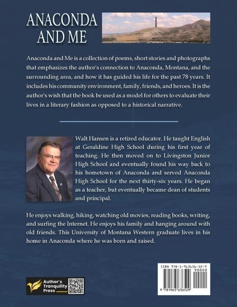Anaconda and Me is a collection of poems, short stories and photographs that emphasizes the author's connection to Anaconda, Montana, and the surrounding area, and how it has guided his life for the past 78 years. It includes his community environment, family, friends, and heroes. It is the author's wish that the book be used as a model for others to evaluate their lives in a literary fashion as opposed to a historical narrative.