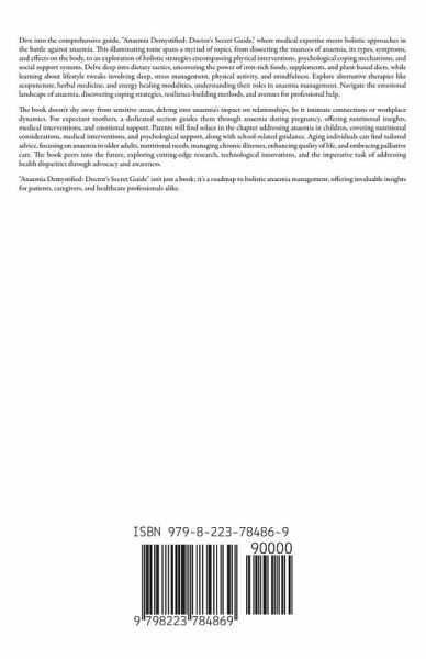 Dive into the comprehensive guide, "Anaemia Demystified: Doctor's Secret Guide," where medical expertise meets holistic approaches in the battle against anaemia. This illuminating tome spans a myriad of topics, from dissecting the nuances of anaemia, its types, symptoms, and effects on the body, to an exploration of holistic strategies encompassing physical interventions, psychological coping mechanisms, and social support systems. Delve deep into dietary tactics, uncovering the power of iron-rich foods, supplements, and plant-based diets, while learning about lifestyle tweaks involving sleep, stress management, physical activity, and mindfulness. Explore alternative therapies like acupuncture, herbal medicine, and energy healing modalities, understanding their roles in anaemia management. Navigate the emotional landscape of anaemia, discovering coping strategies, resilience-building methods, and avenues for professional help. The book doesn't shy away from sensitive areas, delving into anaemia's impact on relationships, be it intimate connections or workplace dynamics. For expectant mothers, a dedicated section guides them through anaemia during pregnancy, offering nutritional insights, medical interventions, and emotional support. Parents will find solace in the chapter addressing anaemia in children, covering nutritional considerations, medical interventions, and psychological support, along with school-related guidance. Aging individuals can find tailored advice, focusing on anaemia in older adults, nutritional needs, managing chronic illnesses, enhancing quality of life, and embracing palliative care. The book peers into the future, exploring cutting-edge research, technological innovations, and the imperative task of addressing health disparities through advocacy and awareness. "Anaemia Demystified: Doctor's Secret Guide" isn't just a book; it's a roadmap to holistic anaemia management, offering invaluable insights for patients, caregivers, and healthcare professionals alike.