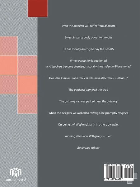 Even the manliest will suffer from ailments Sweat imparts body odour to armpits He has money aplenty to pay the penalty When education is auctioned and teachers become cheaters, naturally the student will be stunted Does the lameness of nameless salesmen affect their maleness? The gardener garnered the crop The getaway car was parked near the gateway When the designer was asked to redesign, he promptly resigned On being swindled one's faith in others dwindles running after lucre Will give you ulcer Butlers are subtler