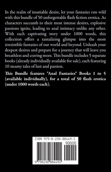 In the realm of insatiable desire, let your fantasies run wild with this bundle of 50 unforgettable flash fiction erotica. As characters succumb to their most intense desires, explosive passions ignite, leading to anal intimacy unlike any other. With each captivating story under 1000 words, this collection offers a tantalizing glimpse into the most irresistible fantasies of our world and beyond. Unleash your deepest desires and prepare for a journey that will leave you breathless and craving more. This bundle includes 5 separate books (already individually available for sale), each featuring 10 steamy tales of lust and passion. This Bundle features "Anal Fantasies" Books 1 to 5 (available individually), for a total of 50 flash erotica (under 1000 words each).