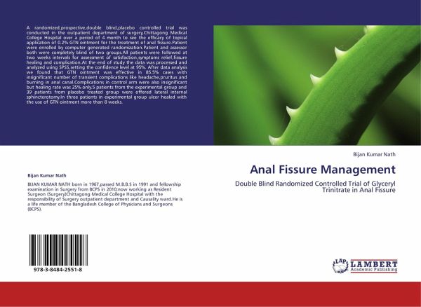 A randomized,prospective,double blind,placebo controlled trial was conducted in the outpatient department of surgery,Chittagong Medical College Hospital over a period of 4 month to see the efficacy of topical application of 0.2% GTN ointment for the treatment of anal fissure.Patient were enrolled by computer generated randomization.Patient and assessor both were completely blind of two groups.All patients were followed at two weeks intervals for assessment of satisfaction,symptoms relief,fissure healing and complication.At the end of study the data was processed and analyzed using SPSS,setting the confidence level at 95%. After data analysis we found that GTN ointment was effective in 85.5% cases with insignificant number of transient complications like headache,pruritus and burning in anal canal.Complications in control arm were also insignificant but healing rate was 25% only.5 patients from the experimental group and 39 patients from placebo treated group were offered lateral internal sphincterotomy.In three patients in experimental group ulcer healed with the use of GTN ointment more than 8 weeks.
