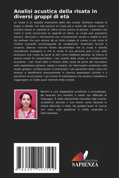 La risata è un aspetto importante della vita umana. Esistono migliaia di lingue e dialetti, ma tutti parlano di risate più o meno allo stesso modo. I bambini hanno la capacità di ridere prima ancora di parlare. I bambini nati ciechi e sordi conservano la capacità di ridere. La risata può esprimere piacere, derisione o nervosismo con un'espulsione vocale e udibile di aria dai polmoni che può variare da un forte scoppio di suono a una serie di risatine tranquille accompagnate da caratteristici movimenti facciali e corporei. Diverse ricerche hanno documentato che la risata è talvolta considerata contagiosa e che la risata di una persona può a sua volta provocare una risata da parte di altri come feedback positivo. La lettura di questo studio fa comprendere i vari aspetti della risata, le caratteristiche acustiche, i vari studi citati e l'analisi della risata da parte del ricercatore nella popolazione giovane, adulta e anziana. Le informazioni contenute nello studio guidano i professionisti a confrontare i vari parametri della risata che aiutano a identificarla precocemente in diverse popolazioni cliniche e a pianificare al più presto i vari servizi di riabilitazione che aiutano il bambino a raggiungere un livello quasi normale nella società.