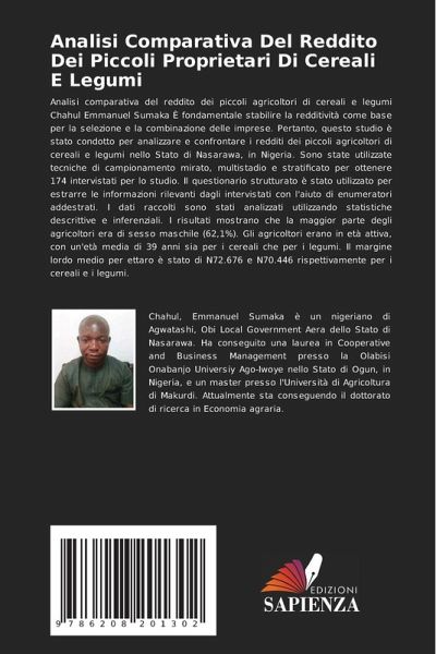 Analisi comparativa del reddito dei piccoli agricoltori di cereali e legumi Chahul Emmanuel Sumaka È fondamentale stabilire la redditività come base per la selezione e la combinazione delle imprese. Pertanto, questo studio è stato condotto per analizzare e confrontare i redditi dei piccoli agricoltori di cereali e legumi nello Stato di Nasarawa, in Nigeria. Sono state utilizzate tecniche di campionamento mirato, multistadio e stratificato per ottenere 174 intervistati per lo studio. Il questionario strutturato è stato utilizzato per estrarre le informazioni rilevanti dagli intervistati con l'aiuto di enumeratori addestrati. I dati raccolti sono stati analizzati utilizzando statistiche descrittive e inferenziali. I risultati mostrano che la maggior parte degli agricoltori era di sesso maschile (62,1%). Gli agricoltori erano in età attiva, con un'età media di 39 anni sia per i cereali che per i legumi. Il margine lordo medio per ettaro è stato di N72.676 e N70.446 rispettivamente per i cereali e i legumi.