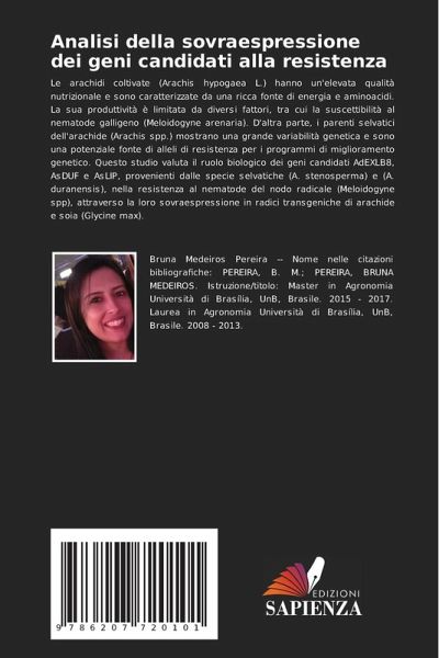 Le arachidi coltivate (Arachis hypogaea L.) hanno un'elevata qualità nutrizionale e sono caratterizzate da una ricca fonte di energia e aminoacidi. La sua produttività è limitata da diversi fattori, tra cui la suscettibilità al nematode galligeno (Meloidogyne arenaria). D'altra parte, i parenti selvatici dell'arachide (Arachis spp.) mostrano una grande variabilità genetica e sono una potenziale fonte di alleli di resistenza per i programmi di miglioramento genetico. Questo studio valuta il ruolo biologico dei geni candidati AdEXLB8, AsDUF e AsLIP, provenienti dalle specie selvatiche (A. stenosperma) e (A. duranensis), nella resistenza al nematode del nodo radicale (Meloidogyne spp), attraverso la loro sovraespressione in radici transgeniche di arachide e soia (Glycine max).