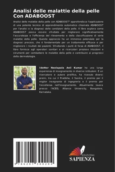 Analisi delle malattie della pelle con ADABOOST" approfondisce l'applicazione di una potente tecnica di apprendimento automatico chiamata ADABOOST per l'analisi e la diagnosi delle condizioni della pelle. Il libro esplora come ADABOOST possa essere sfruttato per migliorare significativamente l'accuratezza e l'efficienza del rilevamento e della classificazione di varie malattie della pelle. Questo approccio ha un immenso potenziale per la diagnosi precoce, che è fondamentale per un trattamento efficace e per migliorare i risultati dei pazienti. Sfruttando i punti di forza di ADABOOST, il libro fornisce agli operatori sanitari e ai ricercatori preziose intuizioni e strumenti per combattere le malattie della pelle e contribuire ai progressi della dermatologia.
