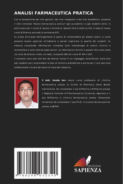 Con la benedizione dei miei genitori, dei miei insegnanti e dei miei benefattori, presento il libro intitolato "Analisi farmaceutica pratica" agli accademici e agli studenti attivi, in particolare per il corso di laurea in Farmacia. Questo libro è stato scritto in base al nuovo corso B.Pharma secondo la normativa PCI.Lo scopo principale dell'argomento è quello di comprendere gli aspetti pratici e come possono essere applicati all'industria e quindi migliorare la qualità dei prodotti. La materia comprende informazioni complete sulle metodologie di analisi chimica e strumentale e sulle relative applicazioni. Le informazioni fornite in questo libro sono state raccolte da diverse riviste, siti web, compendi ufficiali come IP, BP e USP.I contenuti sono stati ben fusi da diverse risorse in un linguaggio semplificato. Sarà utile agli studenti per comprendere le basi di un'unica piattaforma e anche per il loro percorso professionale iniziale dal punto di vista dell'industria.