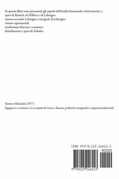 In questo libro sono presentati gli aspetti dell'analisi funzionale relativamente a: spazi di Banach, di Hilbert e di Lebesgue misura secondo Lebesgue e integrale di Lebesgue visione operatoriale trasformate discrete e continue distribuzioni e spazi di Sobolev
