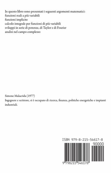 In questo libro sono presentati i seguenti argomenti matematici: funzioni reali a più variabili funzioni implicite calcolo integrale per funzioni di più variabili sviluppi in serie di potenze, di Taylor e di Fourier analisi nel campo complesso