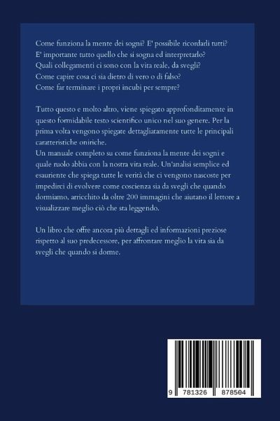 Come funziona la mente dei sogni? E' possibile ricordarli tutti? E' importante tutto quello che si sogna ed interpretarlo? Come capire cosa ci sia dietro di vero o di falso? Come far terminare i propri incubi per sempre? Tutto questo e molto altro viene spiegato approfonditamente in questo formidabile testo scientifico, unico nel suo genere. Per la prima volta vengono spiegate dettagliatamente tutte le principali caratteristiche oniriche. Un manuale completo su come funziona la mente dei sogni e quale ruolo abbia davvero con la nostra vita reale. Un nuovo punto di vista consapevole di come funziona la mente onirica in rapporto alla mente più cosciente.