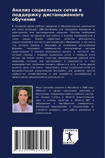 V poslednee wremq uchebnye zawedeniq i obrazowatel'nye uchrezhdeniq wse chasche ispol'zuüt LMS-platformy dlq podderzhki iniciatiw po älektronnomu ili distancionnomu obucheniü. Poätomu neobhodimo izuchit' nowye metodologii dlq raboty i analiza wzaimodejstwiq w takih sredah. Analiz sowmestnyh aspektow deqtel'nosti, osuschestwlqemoj w kontexte distancionnogo obrazowaniq, w chastnosti teh, kotorye swqzany s obscheniem na onlajnowyh diskussionnyh forumah, pokazywaet preimuschestwo ispol'zowaniq metodik predstawleniq i analiza relqcionnyh dannyh, w chastnosti teh, kotorye swqzany s analizom social'nyh setej. S pomosch'ü ätogo metoda my mozhem ponqt' strukturu sformirowannoj rabochej seti, izmeneniq, kotorye ona preterpewaet w zawisimosti ot tipa wzaimodejstwiq, polozhenie kazhdogo sub#ekta w seti, a takzhe drugie aspekty. Cel' ätoj knigi - predstawit' analiz social'nyh setej kak fundamental'nyj analiticheskij instrument dlq razwitiq chuwstwa soobschestwa onlajn-obucheniq i dlq razrabotki raznoobraznyh i äffektiwnyh predlozhenij po deqtel'nosti.