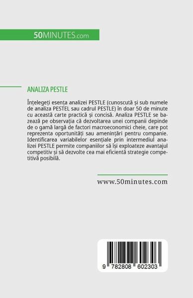 În¿elege¿i esen¿a analizei PESTLE (cunoscut¿ ¿i sub numele de analiza PESTEL sau cadrul PESTLE) în doar 50 de minute cu aceast¿ carte practic¿ ¿i concis¿. Analiza PESTLE se bazeaz¿ pe observäia c¿ dezvoltarea unei companii depinde de o gam¿ larg¿ de factori macroeconomici cheie, care pot reprezenta oportunit¿¿i sau amenin¿¿ri pentru companie. Identificarea variabilelor esen¿iale prin intermediul analizei PESTLE permite companiilor s¿ î¿i exploateze avantajul competitiv ¿i s¿ dezvolte cea mai eficient¿ strategie competitiv¿ posibil¿. Aceast¿ carte v¿ ofer¿ o introducere util¿ în aplicäiile analizei PESTLE atunci când lansäi o noü afacere, proiect sau produs, când reorganizäi o companie ¿i când dezvoltäi o strategie de marketing. De asemenea, include studii de caz din viäa real¿, o discüie despre deficien¿ele instrumentului, inclusiv despre lipsa sa relativ¿ de obiectivitate, ¿i o introducere în modele conexe, cum ar fi analiza SWOT ¿i cele cinci for¿e ale lui Porter. Despre analiza PESTLE Analiza PESTLE urm¿re¿te s¿ analizeze variabilele macroeconomice relevante pentru o organizäie într-un anumit context. Mai precis, le permite managerilor s¿ identifice variabilele politice, economice, socio-culturale, tehnologice, juridice ¿i de mediu ¿i s¿ prevad¿ ce s-ar putea întâmpla în viitor pe baza acestor factori. Acest lucru îl face un instrument valoros pentru preg¿tirea unui plan de afaceri, pentru dezvoltarea strategiilor de produc¿ie sau de marketing ¿i pentru planificarea lans¿rii de noi produse. În aceast¿ carte, ve¿i descoperi cum v¿ poate ajuta analiza PESTLE, ve¿i înv¿¿a cum s¿ clasificäi variabilele macroeconomice care v¿ afecteaz¿ afacerea ¿i ve¿i folosi rezultatele pentru a v¿ planifica eficient viitorul. O explicäie clar¿ a avantajelor ¿i a posibilelor dezavantaje ale metodei, o discüie a unui studiu de caz practic ¿i o introducere în modelele conexe v¿ ofer¿ instrumentele de care ave¿i nevoie pentru a v¿ adapta abordarea la situäia dumneavoastr¿.