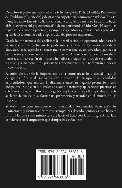 Descubre el poder transformador de la Estrategia A. R. E. (Análisis, Resolución del Problema y Ejecución) y desata todo tu potencial como emprendedor. En este libro, Gonzalo Estrada te lleva de la mano a través de un viaje fascinante hacia el éxito empresarial y la construcción de un patrimonio sólido. Con 19 capítulos repletos de consejos prácticos, ejemplos inspiradores y herramientas probadas, aprenderás a dominar cada etapa crucial del proceso empresarial. Desde la importancia del análisis y la identificación de oportunidades hasta la creatividad en la resolución de problemas y la planificación meticulosa de la ejecución, cada capítulo te acerca más a convertirte en un verdadero generador de ingresos y a alcanzar tus metas financieras. Aprenderás a superar el miedo al fracaso, a tomar acción de manera inmediata, a seguir un plan de seguimiento y ajuste, y a mantener una persistencia y consistencia que te llevarán a nuevos niveles de éxito. Además, descubrirás la importancia de la automatización y escalabilidad, la delegación efectiva de tareas, la administración del tiempo y la mentalidad emprendedora que marcan la diferencia entre un negocio promedio y uno excepcional. Con ejemplos reales de casos hipotéticos y aplicaciones prácticas en diferentes áreas, este libro es una guía completa para aquellos que desean salir adelante de sus deudas, formar un patrimonio y triunfar en el mundo de los negocios. Si estás listo para transformar tu mentalidad empresarial, dejar atrás las limitaciones y alcanzar el éxito que siempre has deseado, ¡entonces este libro es para ti! Empieza hoy mismo tu viaje hacia el éxito con la Estrategia A. R. E. y conviértete en el empresario que siempre has soñado ser.