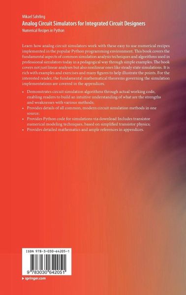 Learn how analog circuit simulators work with these easy to use numerical recipes implemented in the popular Python programming environment. This book covers the fundamental aspects of common simulation analysis techniques and algorithms used in professional simulators today in a pedagogical way through simple examples. The book covers not just linear analyses but also nonlinear ones like steady state simulations. It is rich with examples and exercises and many figures to help illustrate the points. For the interested reader, the fundamental mathematical theorems governing the simulation implementations are covered in the appendices.