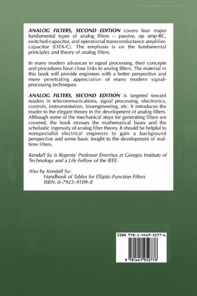 Analog Filters, Second Edition covers four major fundamental types of analog filters - passive, op amp-RC, switched-capacitor, and operational transconductance amplifier-capacitor (OTA-C). (The last of these types is the major addition in the Second Edition). The emphasis is on the fundamental principles and theory of analog filters. It is targeted toward readers in telecommunications, signal processing, electronics, controls, instrumentation, bioengineering, etc. It introduces the reader to the elegant theory in the development of analog filters. Although some of the mechanical steps for generating filters are covered, the book stresses the mathematical bases and the scholastic ingenuity of analog filter theory. It should be helpful to nonspecialist electrical engineers to gain a background perspective and some basic insight to the development of real-time filters. In many modern advances in signal processing, their concepts and procedures have close links to analog filters.The material in this book will provide engineers with a better perspective and more penetrating appreciation of many modern signal-processing techniques.