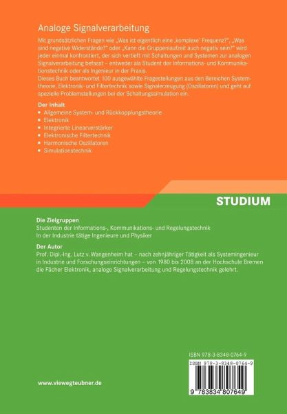 Dieses Buch beantwortet 100 ausgewählte Fragestellungen aus den Bereichen Systemtheorie, Verstärker- und Filtertechnik sowie Signalerzeugung (Oszillatoren) und geht auf spezielle Problemstellungen bei der Schaltungssimulation ein.