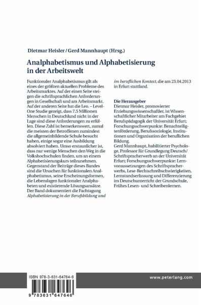Inhalt: Roland Merten: Grußwort des Thüringer Ministeriums für Bildung, Wissenschaft und Kultur zum Aktionstag «Lesen & Schreiben - Mein Schlüssel zur Welt» am 22. April 2013 in Erfurt - Gerhard Christe: Alphabetisierung in der Berufsbildung - Dietmar Heisler: Warum kommen (so) wenige Menschen in Alphabetisierungskurse? Erklärungsansätze und Forschungsdesiderata - Henriette Hanisch: «Alpha-Quali»: Qualifizierung berufspädagogischen Personals zur lebenslagenorientierten, inklusiven Alphabetisierung junger Erwachsener. Erste Ergebnisse der Teilnehmendenbefragung - Annett Ammer-Wies/Michael Nitsche: Struktur von innen. Kollegiale Beratung als strukturstärkendes Element der Berufsprofessionalisierung für Lehrende in der Alphabetisierung und Grundbildung. Ein Modellversuch an der Volkshochschule Leipzig - Sonja Puchelski/Laura Schudoma: BasisKom - Basiskompetenz am Arbeitsplatz stärken - Birgit Eckhardt-Hinz/Henriette Hanisch/Dietmar Heisler/Gerd Mannhaupt: «Alpha-Quali»: Qualifizierung berufspädagogischen Personals zur lebenslagenorientierten, inklusiven Alphabetisierung junger Erwachsener - Lena Bömelburg/Martina Kunzendorf: DoQ - Dortmunder Grundbildungsqualifizierung. Ein Vorhaben zur Entwicklung und Implementierung von Bildungsangeboten für geringqualifizierte Arbeitnehmerinnen und Arbeitnehmer - Lutz Kallnbach: Adressatenspezifische Alphabetisierungs- und Grundbildungsarbeit PRO-JOB Arbeitsplatzorientierte Grundbildung in Südthüringer Unternehmen, BTZ Rohr-Kloster - Uwe Hupfer/Andrè Meinhardt: NOthA- Netzwerk Ostthüringen für Alphabetisierung - Sarina Glowatzki: Lebenskünstler Analphabet: Wie stellt sich die Lebenssituation funktionaler Analphabeten dar? - Julia Rauschenbach/Jana Sobol: Alphabetisierungsarbeit im Jugendstrafvollzug. Zwischen Lebensbewältigung, Erziehungsauftrag und Resozialisierung.
